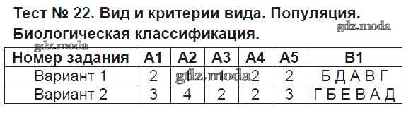 ГДЗ решение к заданию № Тест №22. Вид и критерии вида. Популяция. Биологическая классификация Биология 9 класс контрольно-измерительные материалы Богданов Н.А. ВАКО 2017 ФГОС бесплатно на гдз.мода!