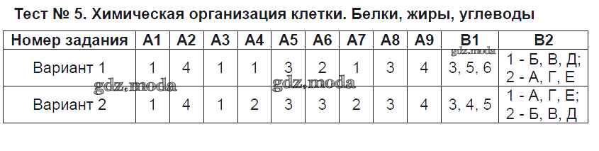 ГДЗ решение к заданию № Тест №5. Химическая организация клетки. Белки, жиры, углеводы Биология 9 класс контрольно-измерительные материалы Богданов Н.А. ВАКО 2017 ФГОС бесплатно на гдз.мода!
