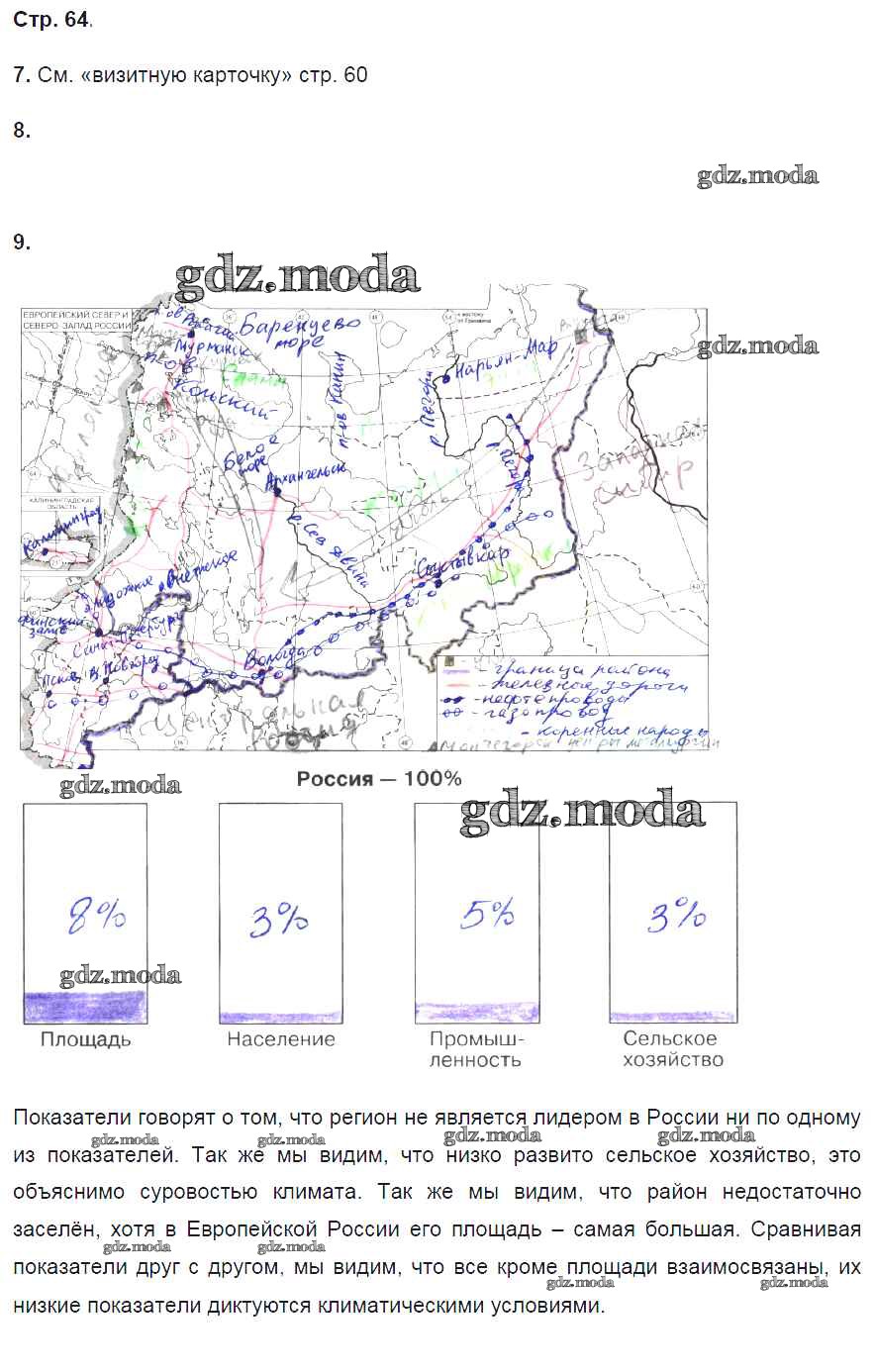 ГДЗ решение к заданию № 64 География России 9 класс рабочая тетрадь Баринова И.И. (к уч. Дронова) Дрофа 2016 ФГОС бесплатно на гдз.мода!