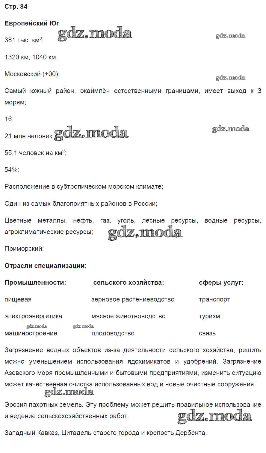 ГДЗ решение к заданию № 84 География России 9 класс рабочая тетрадь Баринова И.И. (к уч. Дронова) Дрофа 2016 ФГОС бесплатно на гдз.мода!