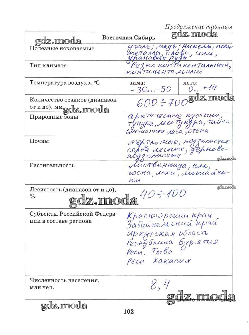 ГДЗ решение к заданию № 102 География 9 класс Рабочая тетрадь Домогацких Е.М. (к уч. Домогацких) Русское слово 2018 ФГОС бесплатно на гдз.мода!