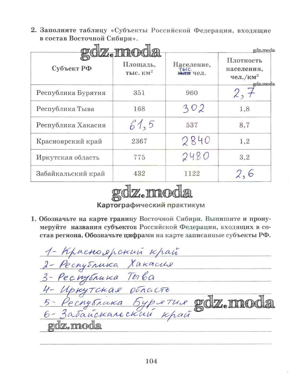 ГДЗ решение к заданию № 104 География 9 класс Рабочая тетрадь Домогацких Е.М. (к уч. Домогацких) Русское слово 2018 ФГОС бесплатно на гдз.мода!