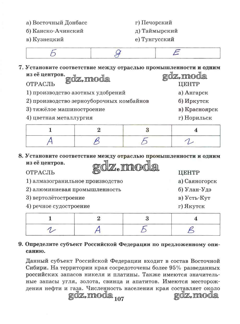 ГДЗ решение к заданию № 107 География 9 класс Рабочая тетрадь Домогацких Е.М. (к уч. Домогацких) Русское слово 2018 ФГОС бесплатно на гдз.мода!