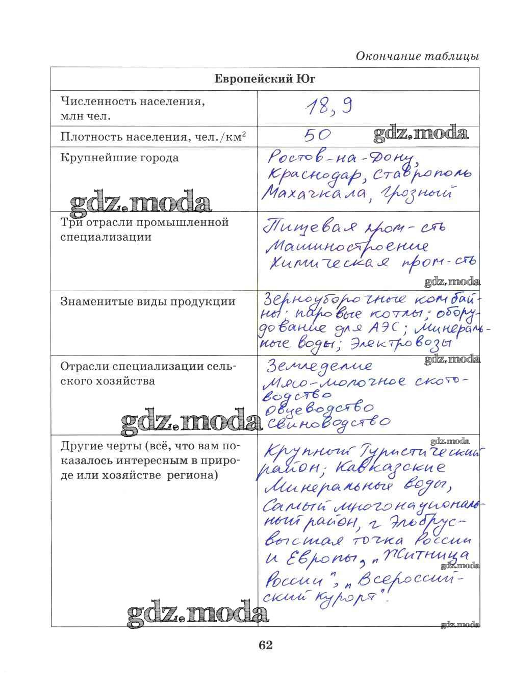 ГДЗ решение к заданию № 62 География 9 класс Рабочая тетрадь Домогацких Е.М. (к уч. Домогацких) Русское слово 2018 ФГОС бесплатно на гдз.мода!