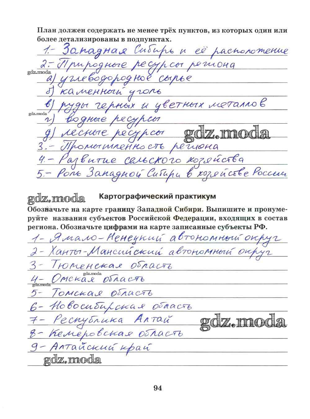 ГДЗ решение к заданию № 94 География 9 класс Рабочая тетрадь Домогацких Е.М. (к уч. Домогацких) Русское слово 2018 ФГОС бесплатно на гдз.мода!