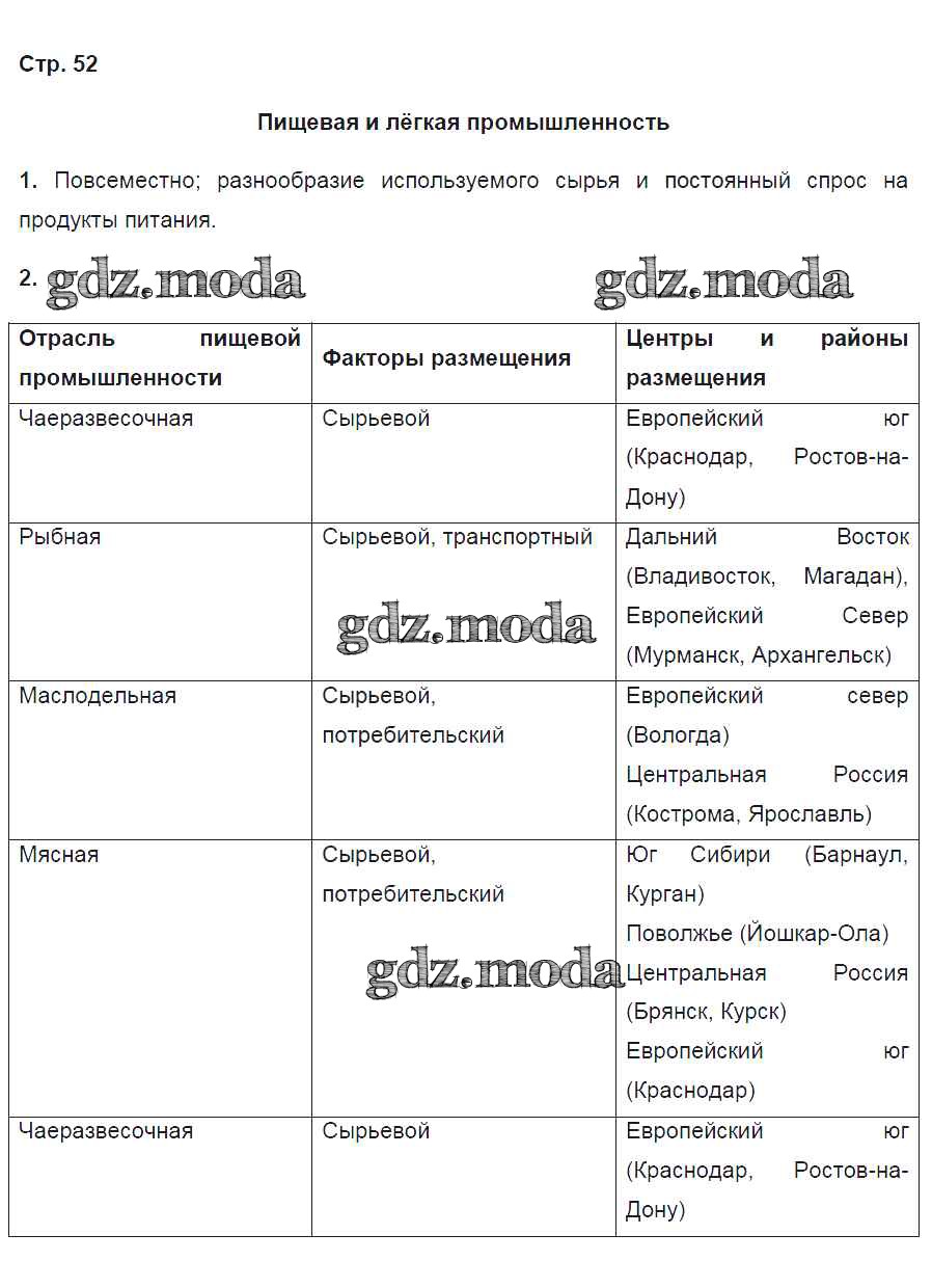 ГДЗ решение к заданию № 52 География России. Население и хозяйство 9 класс рабочая тетрадь Дронов В.П. (к уч.Дронова) Дрофа 2020 ФГОС бесплатно на гдз.мода!