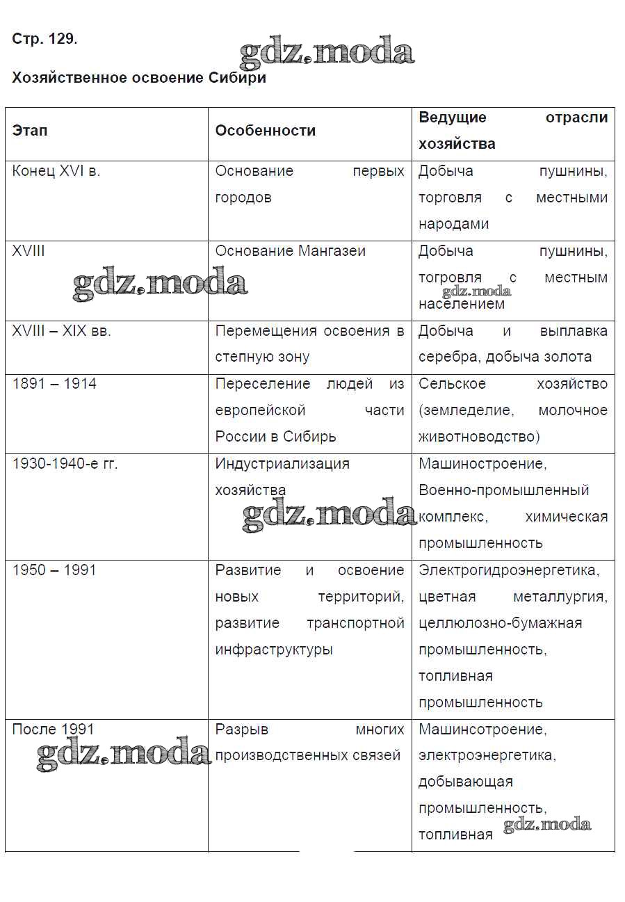 ГДЗ решение к заданию № 129 География России. Хозяйство и географические районы 9 класс рабочая тетрадь Ким Э.В. (к уч. Алексеева) Дрофа 2017 ФГОС бесплатно на гдз.мода!