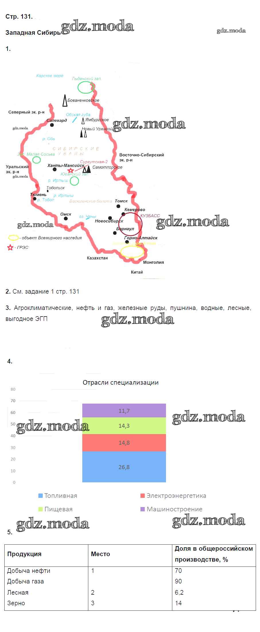 ГДЗ решение к заданию № 131 География России. Хозяйство и географические районы 9 класс рабочая тетрадь Ким Э.В. (к уч. Алексеева) Дрофа 2017 ФГОС бесплатно на гдз.мода!