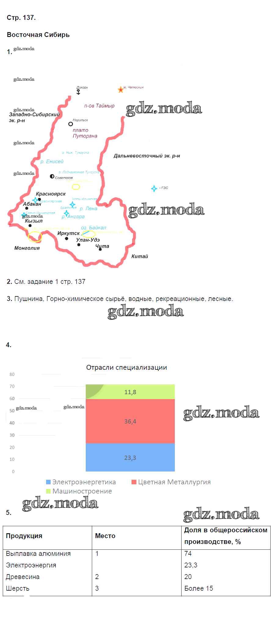 ГДЗ решение к заданию № 137 География России. Хозяйство и географические районы 9 класс рабочая тетрадь Ким Э.В. (к уч. Алексеева) Дрофа 2017 ФГОС бесплатно на гдз.мода!