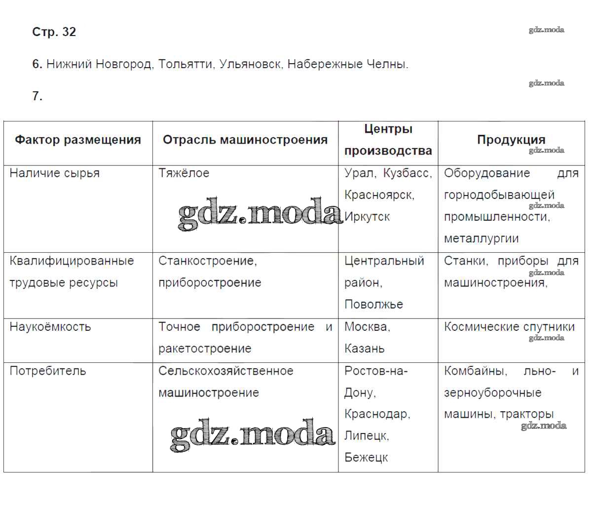 ГДЗ решение к заданию № 32 География России. Хозяйство и географические районы 9 класс рабочая тетрадь Ким Э.В. (к уч. Алексеева) Дрофа 2017 ФГОС бесплатно на гдз.мода!