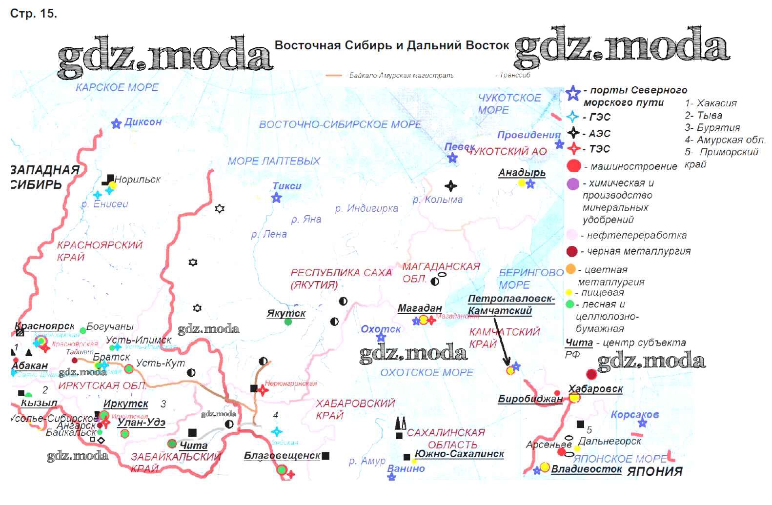 ГДЗ решение к заданию № стр.15. Восточная Сибирь и Дальний Восток-2 География 9 класс контурные карты Приваловский А.Н. Дрофа 2020 ФГОС бесплатно на гдз.мода!