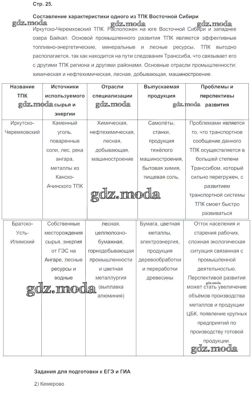 ГДЗ решение к заданию № 25 География России. Население и хозяйство 9 класс Рабочая тетрадь с контурными картами Сиротин В.И. Дрофа 2020 ФГОС бесплатно на гдз.мода!