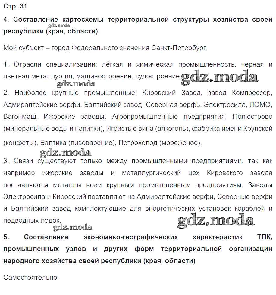 ГДЗ решение к заданию № 31 География России. Население и хозяйство 9 класс Рабочая тетрадь с контурными картами Сиротин В.И. Дрофа 2020 ФГОС бесплатно на гдз.мода!