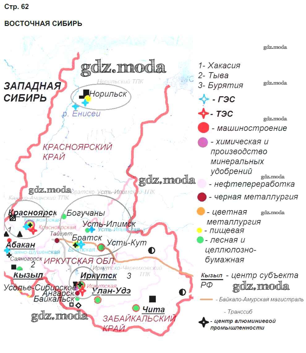 ГДЗ решение к заданию № 62 География России. Население и хозяйство 9 класс Рабочая тетрадь с контурными картами Сиротин В.И. Дрофа 2020 ФГОС бесплатно на гдз.мода!
