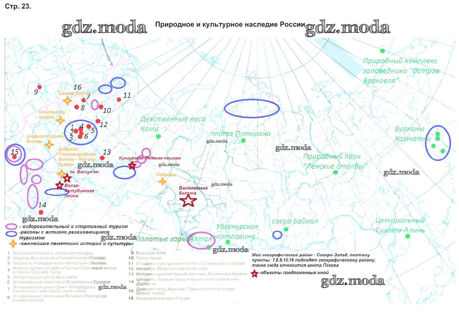 ГДЗ решение к заданию № стр.23. Природное и культурное наследие России География 9 класс Контурные карты. Учись быть первым! Приваловский А.Н. Дрофа 2020 ФГОС бесплатно на гдз.мода!