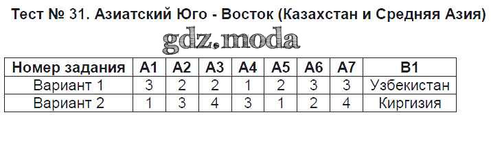 ГДЗ решение к заданию № Тест №31. Азиатский Юго - Восток (Казахстан и Средняя Азия) География 9 класс контрольно-измерительные материалы Жижина Е.А. ВАКО 2017 ФГОС бесплатно на гдз.мода!