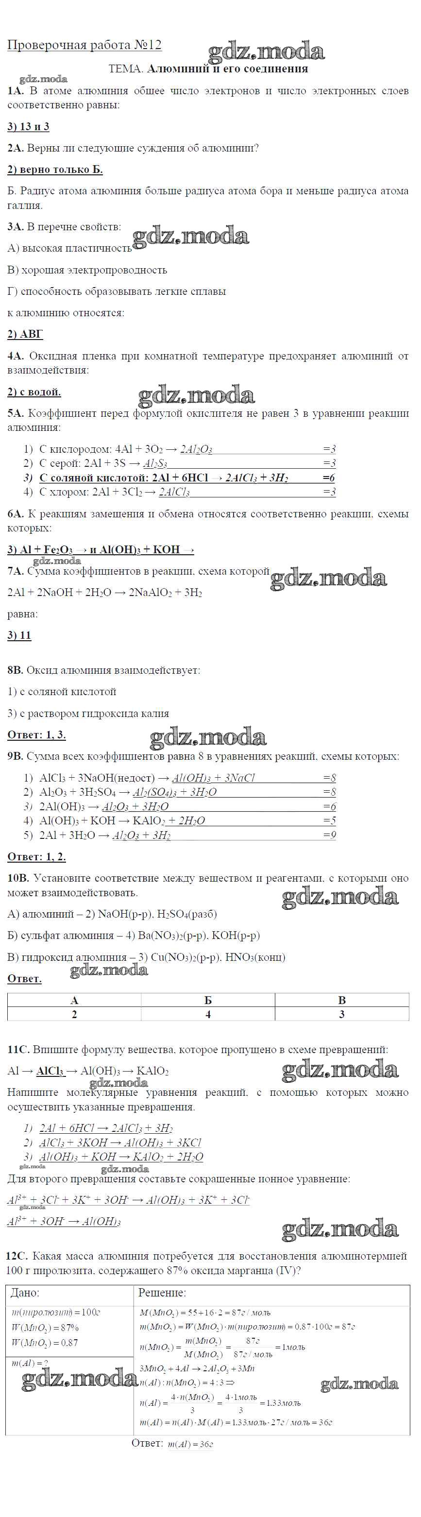 ГДЗ решение к заданию № ПР-12. Алюминий и его соединения Химия 9 класс тетрадь для оценки качества знаний Габриелян О.С. (к уч. Габриеляна) Дрофа 2017 ФГОС бесплатно на гдз.мода!