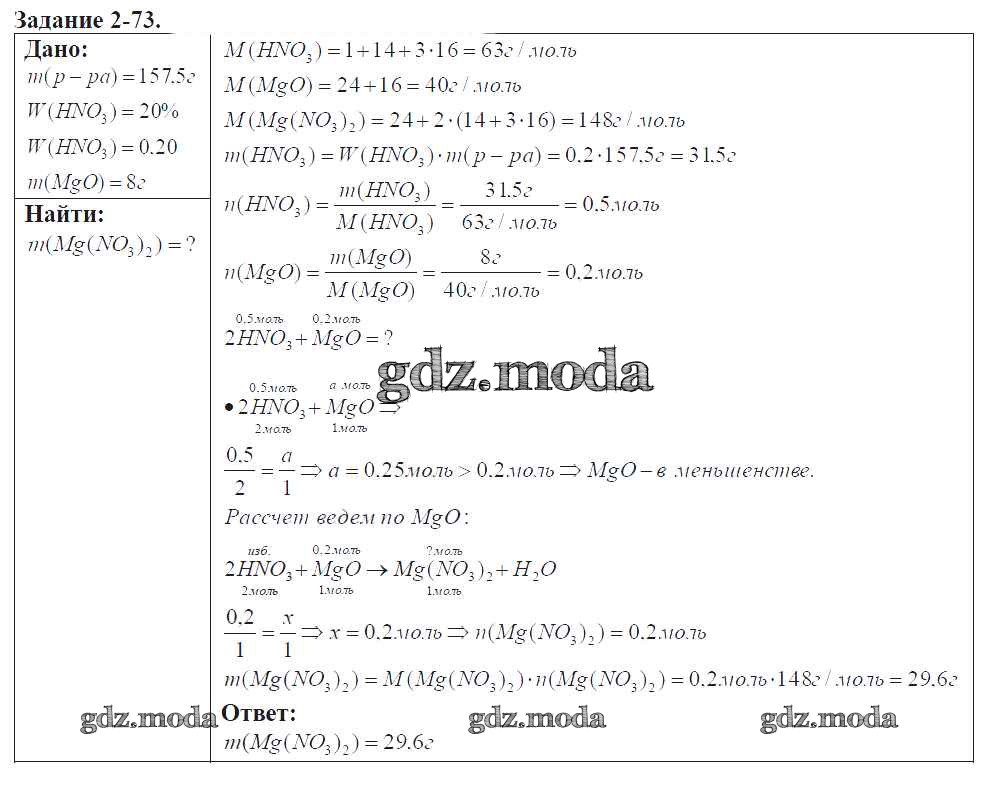 ГДЗ решение к заданию № 2-73 Химия 9 класс задачник Кузнецова Н.Е. Вентана-граф 2015 ФГОС бесплатно на гдз.мода!