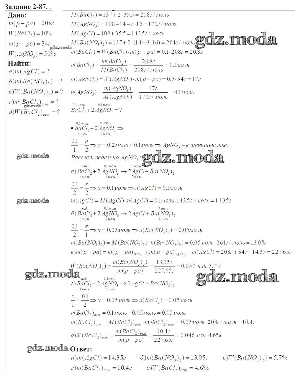 ГДЗ решение к заданию № 2-87 Химия 9 класс задачник Кузнецова Н.Е. Вентана-граф 2015 ФГОС бесплатно на гдз.мода!
