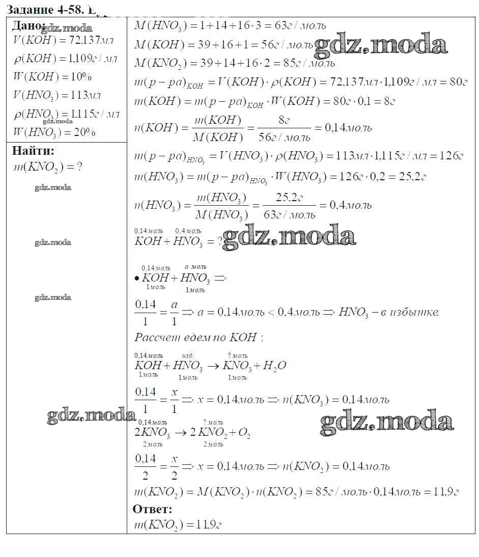 ГДЗ решение к заданию № 4-58 Химия 9 класс задачник Кузнецова Н.Е. Вентана-граф 2015 ФГОС бесплатно на гдз.мода!